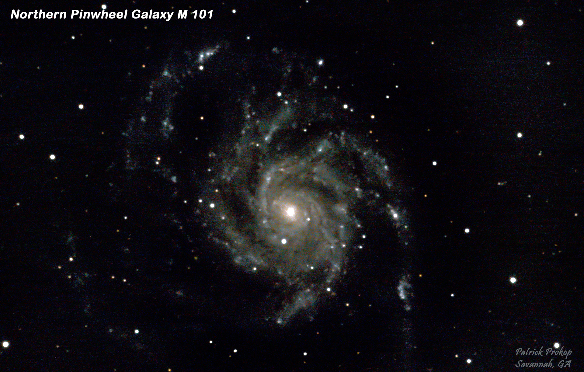 The Northern Pinwheel Galaxy, also known as Messier 101. This galaxy is high in the north at midnight in late April near the Big Dipper in the constellation of Ursa Major. I took this with the Celestron 11" telescope at f/7 (via the 0.7X reducer lens). It is about 22 million light-years away. This large galaxy contains over a trillion stars! In comparison, our Milky Way Galaxy has about 250 billion stars and the southern Pinwheel Galaxy (M83) has about 40 billion stars. this is a 1 hr 50 min exposure.