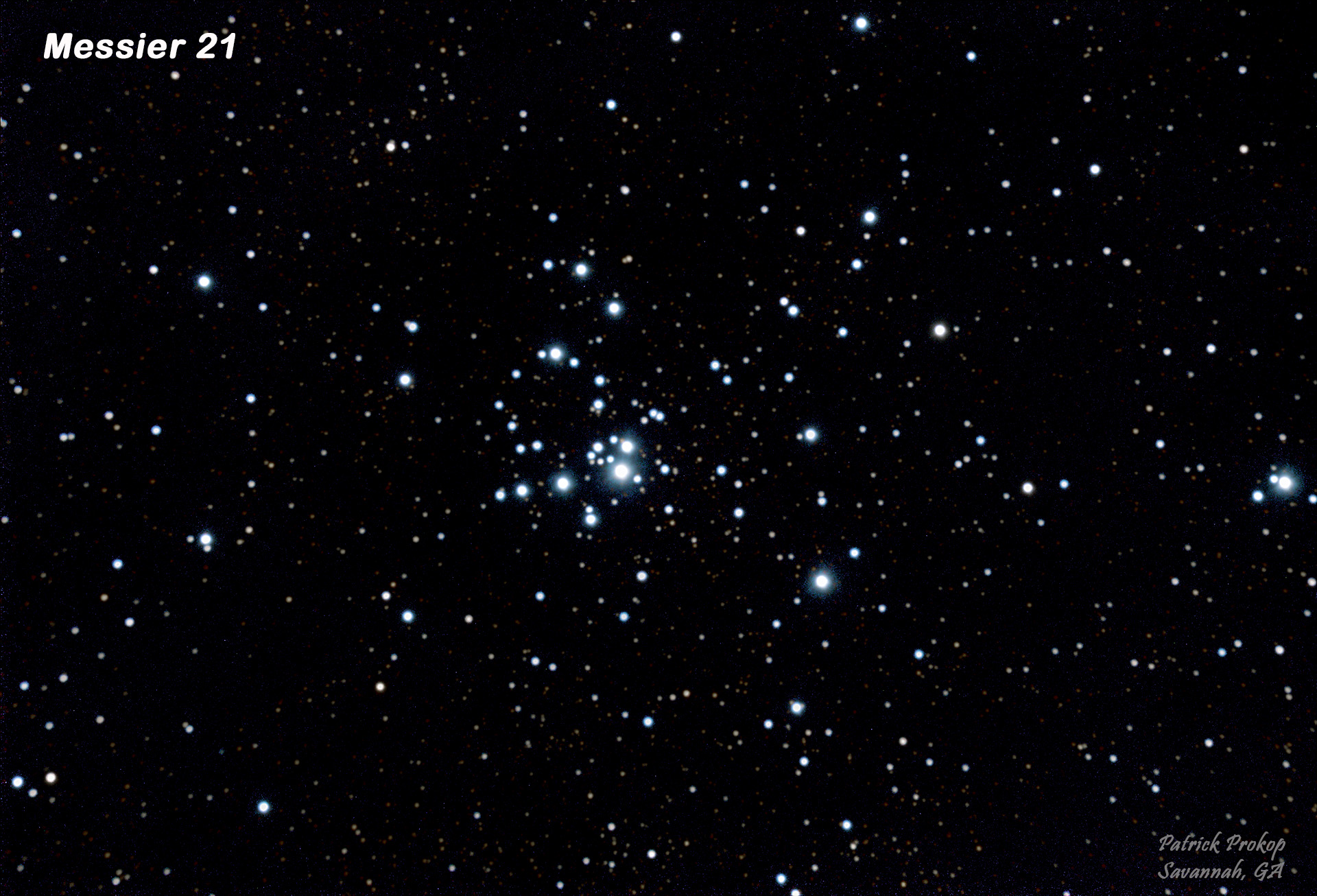 Messier 21 (NGC 6531)is a compact open cluster in the constellation of Sagittarius within that arm of the Milky Way, which is positioned less than one degree northeast of the Trifid Nebula (M20). It contains about 60 stars, mostly white but with a sprinkling of blue giants. It is about 4,200 light-years away and is about the same age as our sun, 4.6 billion years. It is medium high in the south at midnight in July. Click on the picture for a larger view.