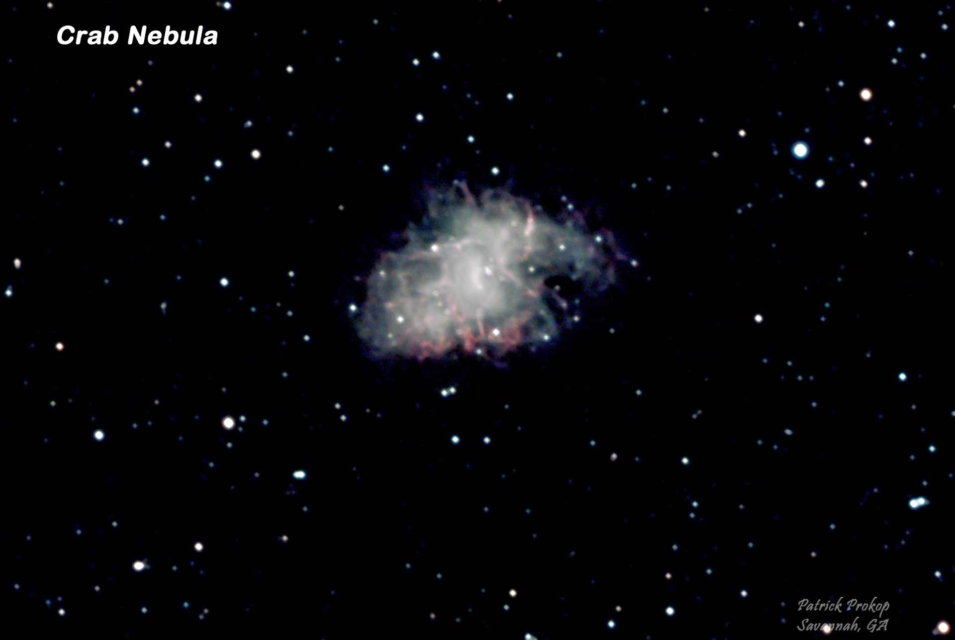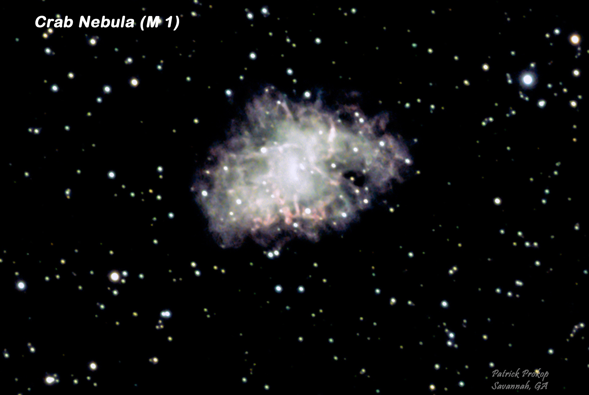The Crab Nebula is in the constellation of Taurus the Bull and is the remnant of an exploding star (supernova) that occurred in 1054. What we see today is the outgassing of that explosion. It is about 6,500 light years away. I took this image April 21, 2019. This nebula is medium high in the WNW at sunset in mid April. I started shooting once the twilight ended at 9:15 and ended at 10:11 after which the object fell behind the trees. Click on pictures for larger view.
