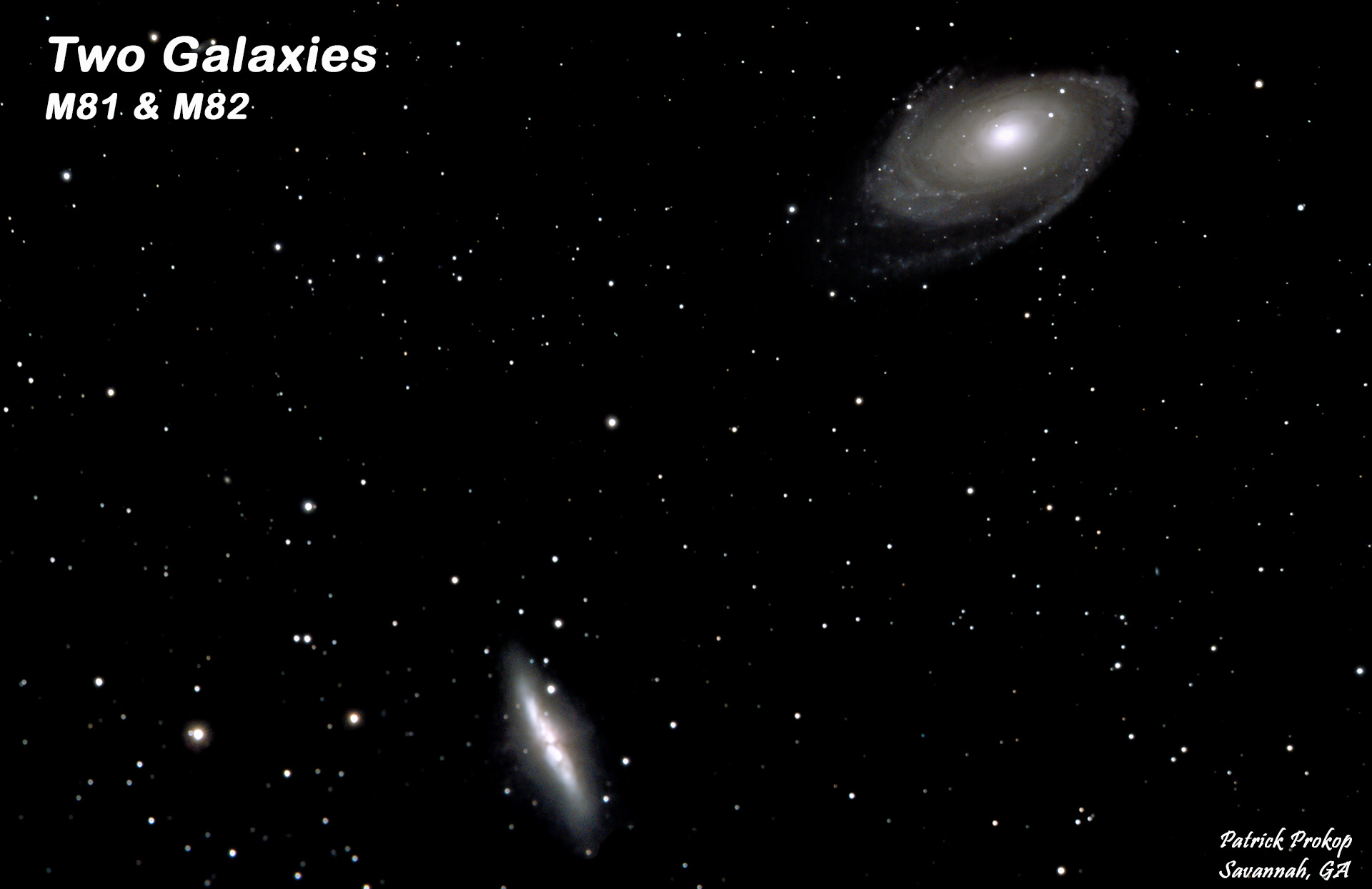 Bode's galaxy is very near the Cigar galaxy (M82) in the sky view. With a slightly wider field of view, you can see both galaxies in the same view. M82 is fainter than M81 and a very different type of galaxy. It's a starburst galaxy, in which stars are been formed at exceptionally high rates. Also known as the Cigar galaxy, M82 is the prototype object and provides a striking contrast to the near perfect spiral shape of M81. Even though these two galaxies are about 12 million light-years from earth, their actual distances from each other is about 150,000 light-years. They are the largest members of the M81 Group, a physical association of of 34 galaxies all bound together with a comon gravitational core.