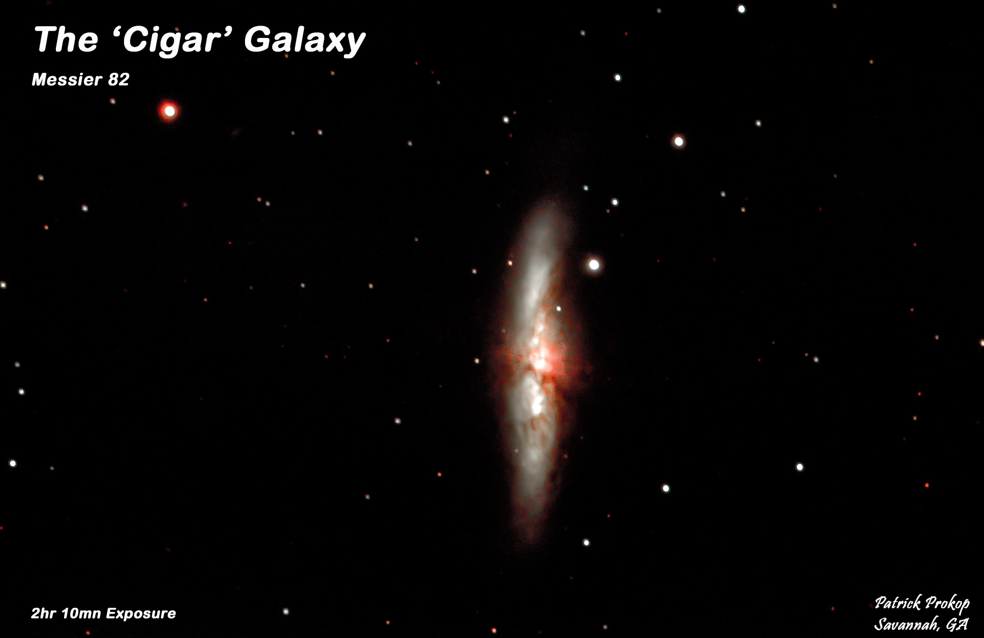 Messier 82 is a galaxy appearing in our vantage view as 'edge on' and appears long and thin and is also known as the 'Cigar galaxy' due to the appearance in the shape of a cigar. It is about 11.5 million light-years from us and contains about 30 billion stars, many of which are forming at exceptionally high rates. My goal was to get the hot red core expelling outward perpendicular to the plane of the galaxy. It will take more than just 2 hours of exposure time to get the full effect, but I did manage to capture some of it. This galaxy appears in the northern sky in early January around 10 pm in the constellation of Ursa Major, to the upper right of the big dipper.