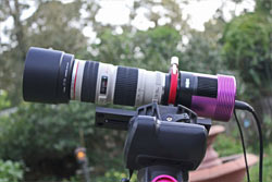 You don't have to have a telescope to get involved with astrophotography, a good camera with a lens is a start. This is the Canon EF 70-200mm f/4L USM Telephoto Zoom Lens which you can attach to a DSLR camera or to a dedicated astrophotography camera. In this case, the lens is attached to a One Shot Color (OSC) CMOS camera. It's important to have a sturdy tripod. However, unless you have an equatorial mount to track the rotation of the earth, you won't be able to shoot longer than 5-10 seconds before you begin to see streaking or smearing of the stars. However, with these new 'stacking' programs, you can take several short exposures and them 'stack' them together resulting in a clean longer exposure image containing more detail.